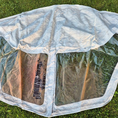 Den mjuke topphatten har ein størrelse på 175 x 175 cm , men utsparing o.l for spegler , samt feste stropper.