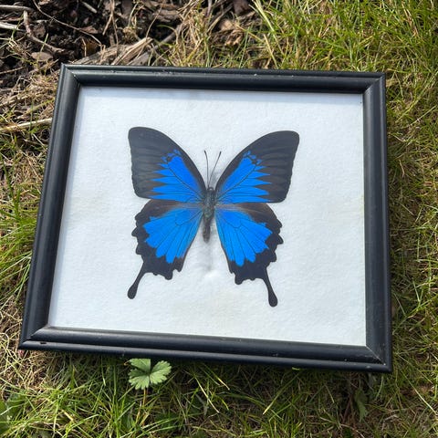 Unik tropisk sommerfugl Morpho deidamia montert i svart ramme.