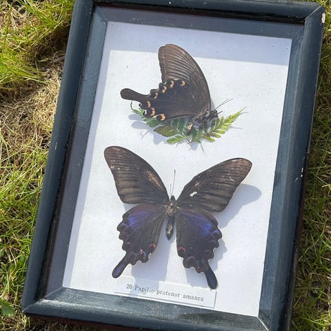 Veldig vakker sommerfugl med sin metallic blå striper på vingene.