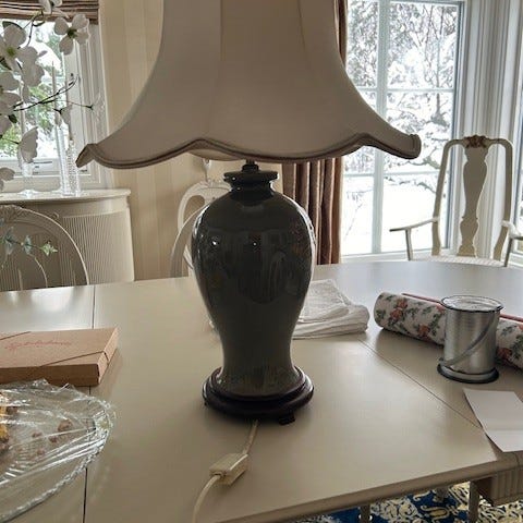 Gammel lampe med ny lampeskjerm. Ser hel og pen ut. Ca 29 cm med skjermen. Hentes på Høybråten. Sendes ikke.