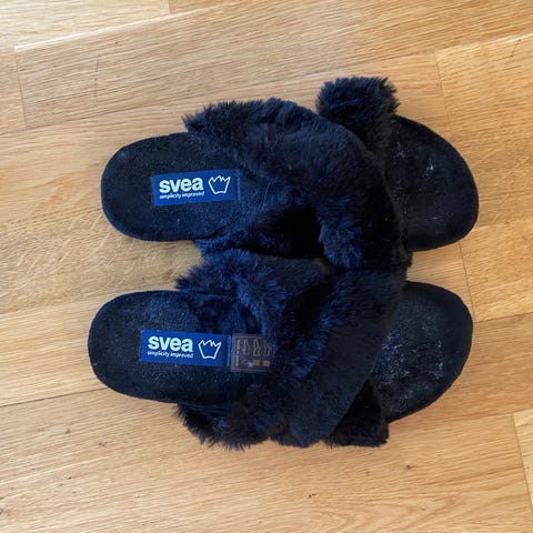 Pent brukte tøfler, mykt stoff inni, maskinstrikket utenpå, gummiaktig såle. Ingen lukt.