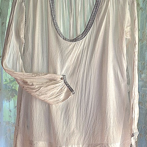 100 % lett bomull, str M med masse vidde. Ser for meg at den passer best til en høy tynn kvinne som kan bære dette spesielle plagget.