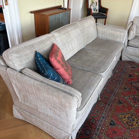 Pen 3-seter brukt av bestemor, står midlertidig på hytte nær Halden. Ingen flekker, hull eller annet som jeg har sett. Kjøper må selv ordne transport.