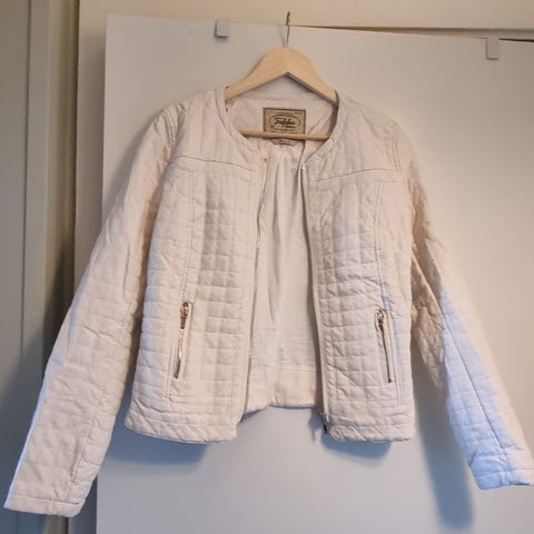 Zara jakke for dame i størrelse L. Jakken er hvit og har en vevd tekstur med rutemønster. Den har krage, lange ermer og lukkes med knapper i front. Modellen har lommer foran. Passer til bruk over topp, kjole eller bluse i hverdagen eller til mer formelle anledninger.
