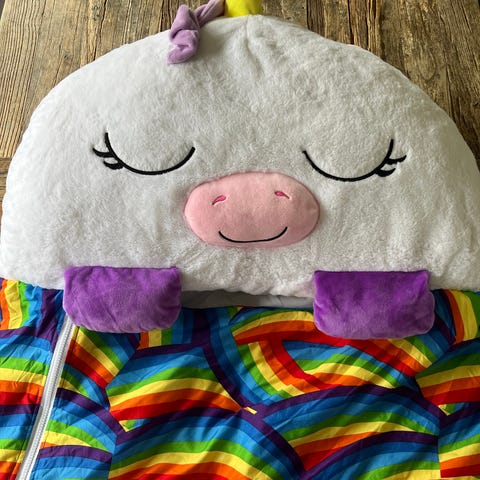 Søt og fin sovepose, passer til alle barn opptil lengde lengde 137cm. Blir til en kose-pute når den rulles sammen.
