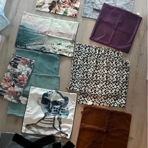 Putetrekk fra Kremmerhuset selges helst samlet 350.- Men ta kontakt om du ønsker kun å kjøpe et eller flere av de, så blir vi enige om pris. Fine blåtoner. Pent brukt, røykfritt hjem. Kan sendes mot at kjøper betaler frakt.