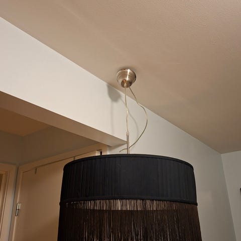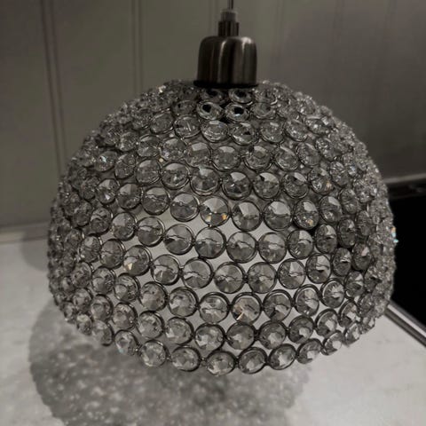 Selger en stor og stilig rund taklampe med «krystaller». Gir veldig fint lys om kvelden.
