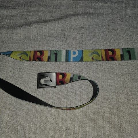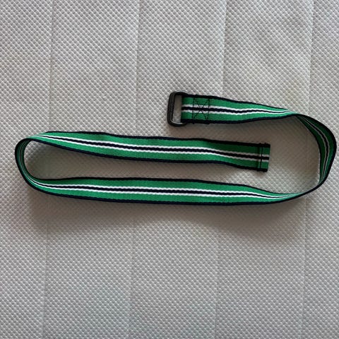 Grønn: 55 cm. fra spenne og til hullet i midten. Spenna er slitt.