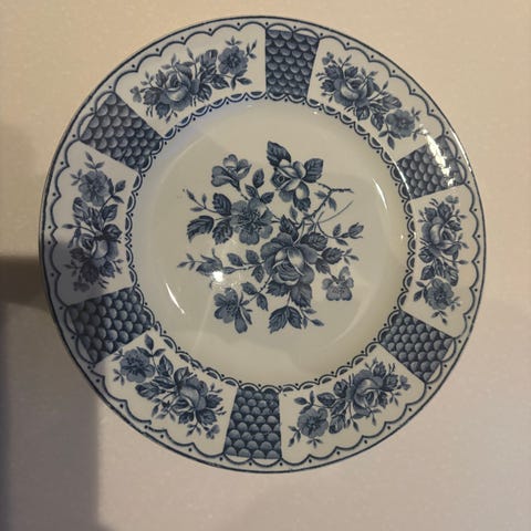 En stk asjett fra Engeland i serien Queens Out of the blue 21,5 i dia. Selges