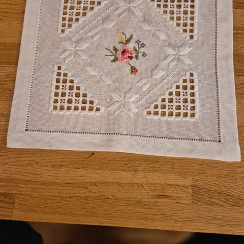 2 nydelige håndbroderte brikker i Hardangersøm og med broderi, ubrukte.