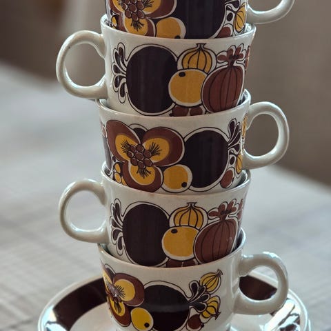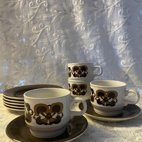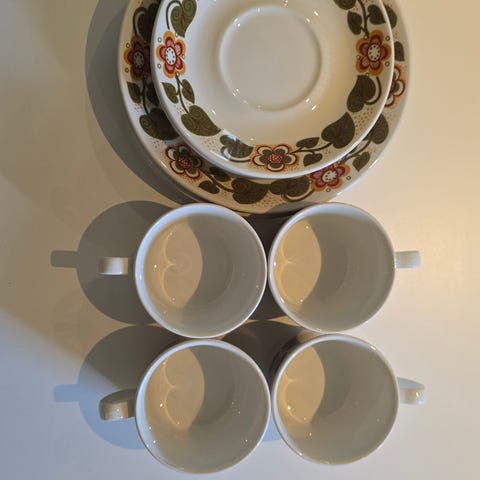 2 Biltons Tableware (Kopp, skål og asjett) og 1 skål, 2 asjetter og 2 kopper med skår. Kann også sendes
