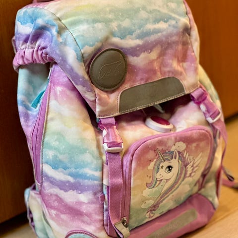 Lilla skolesekk med enhjørninge-og regnbuemønster.