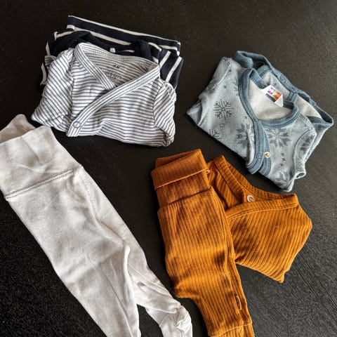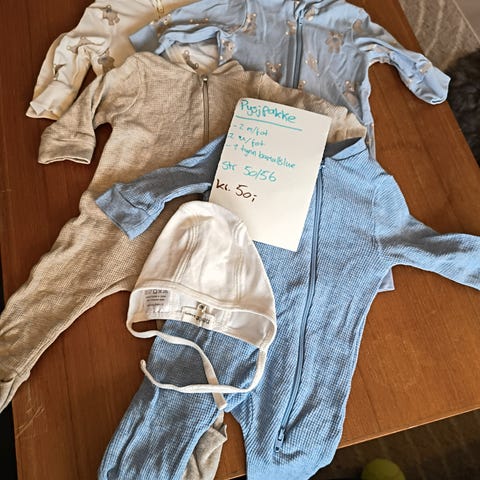 Liten klespakke med 2 stk polarn o pyret bodyer str 50-56. Svært lite brukt. Får også med tynn newbie bamselue str 1-4mnd.