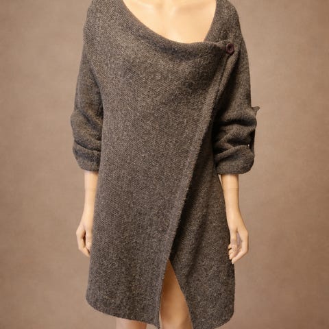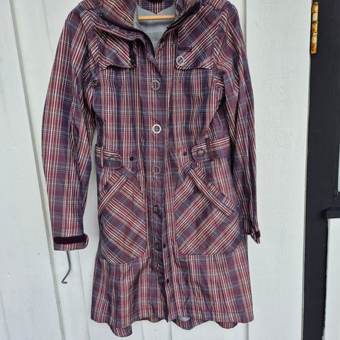 Pen "Bergans" kåpe, str. M. halvsid. Brun farge, diskret rutet. Vannavstøtende stoff, lunt foret med fleece. Trykk-knapper og glidelås foran, krage. Kan kneppes helt opp hvis ønskelig. Lett innsvinget modell, litt lengre bak enn foran. Lengde ca. 93 cm. målt fra øverst skulder og ned foran. Stikklommer med glidelås i begge sider. Vask 30 gr. Lite og pent brukt, ren, utmerket stand. Pris som ny 1500,-