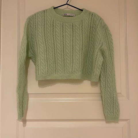 Pent brukt lys blå strikkajakke av ull selges.