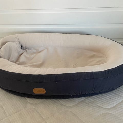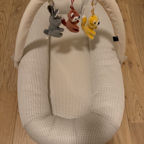 Babynest frå Yngri i lys gråblå farge. Ein del brukt, men alltid med teppe over, slik at gulp og søl vart fanga opp av det. Trekket er nyvaska og utan synlege flekkar.