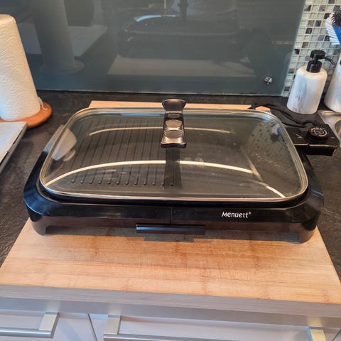 Point bordgrill. Ser ubrukt ut, men den ene skuffen har fått seg en liten knekk i hjørnet. Man kan ta av metallbeslag på begge sider.
