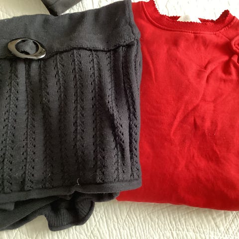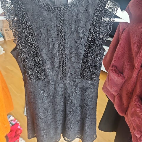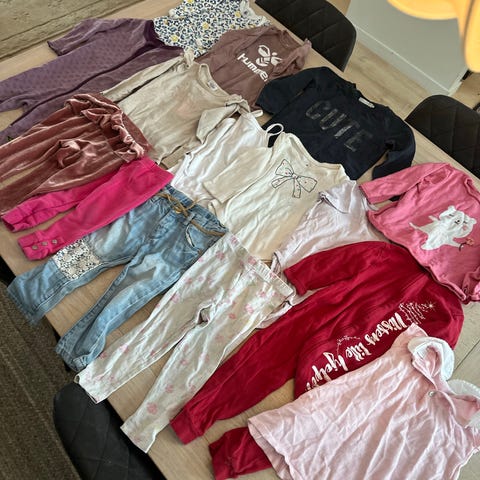 Svart H&M kjole 8-10år, Gul Elloskjole med hette 134/140, heimestrikka juleskjørt, H&M jeans 134, Lilla H&M kjole 134, H&M skjortekjole 134.