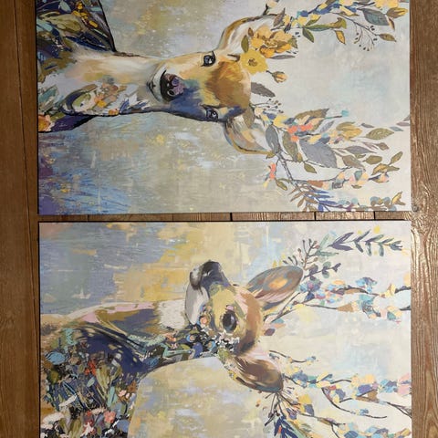 Håndmalte bilder av spælsau ( malt av undertegnede) . 500kr for 2stk (par). En hvit og en grå. 30x30cm, oppheng på baksiden. Kan selvfølgelig sendes, med Posten, kjøper betaler porto. Jeg har vipps