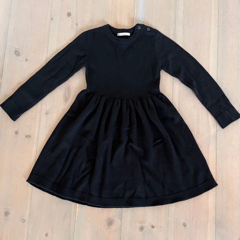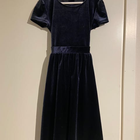 Søt kjole i mørkeblå med overdel i fløyel og chiffon underdel med underskjørt. Sølv kant i livet er med strikk. Brukt kun noen få ganger.
