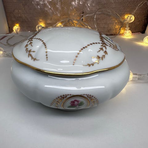 franske Limoges. Dekorert med roser og blomster i gull, legg også merke til den lille blomsten innvendig i lokket. Forseggjort kanting i messing med et kamskjell som lukke i front. Boksen er 12 cm høy. Ingen hakk eller skår