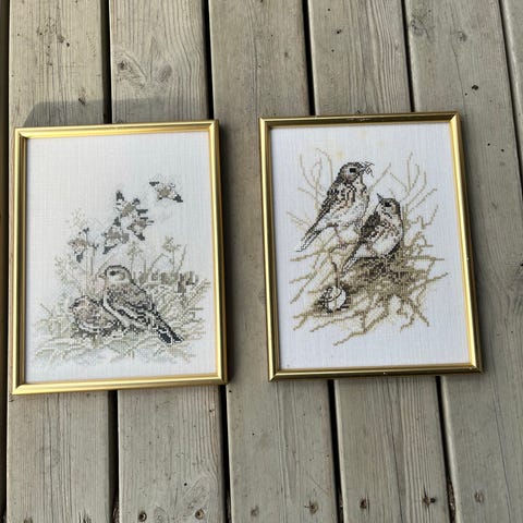 Broderi av svaner i ramme med glass