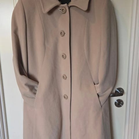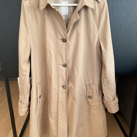 Klassisk beige trenchcoat med fem knapper, og en knapp øvers i halsen til kragen.