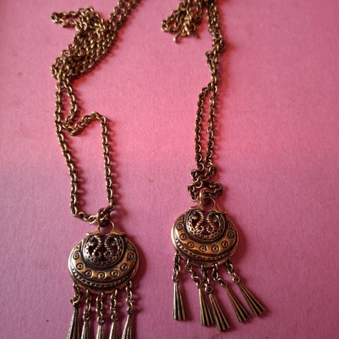 Nydelig sett fra Astri Holthe «Måne Gudinne» Halskjede og øreheng i polert bronse. Lengde kjede 70 cm, anheng 5 x 3 cm. Øreheng måler 4 x 2 cm. Begge deler i flott stand. Nydelig sett fra AH dette, fra 70 tallet.