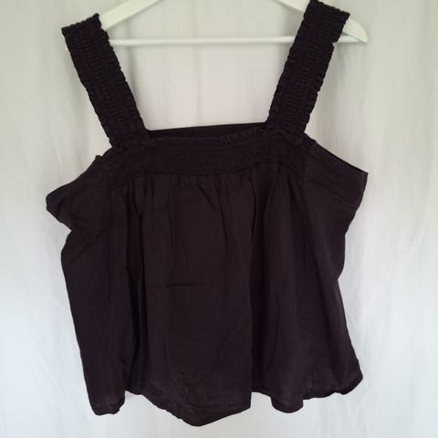 100% lin, deilig å ha på. Brede skulderremser, litt kortere bak enn foran, sitter løst på kroppen