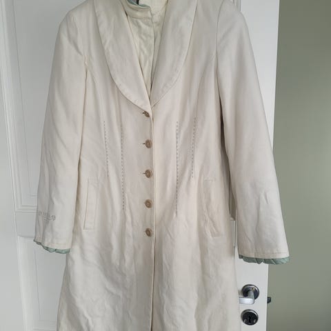 Lekker kåpe i creme farge fra det italienske motehuset Dolce & Gabbana selges rimelig. Det er et par løse tråder og snurr på belte ( se bilder) etter renseri- besøk. Ellers veldig fin.