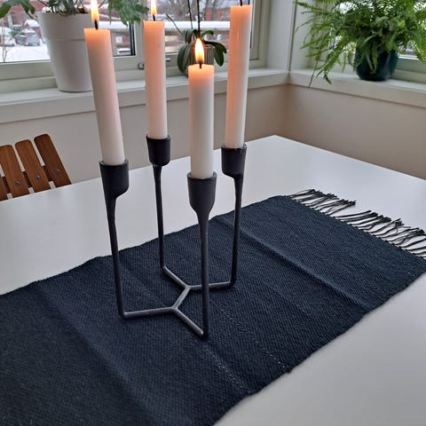 Selger to like mørkeblå juleduker fra Mobilia Design Norge A/S. Den ene duken er ubrukt, den andre brukt noen få ganger. Selges da de bare har blitt liggende. Har også nye flaskeposer i samme design som også er ubrukte.