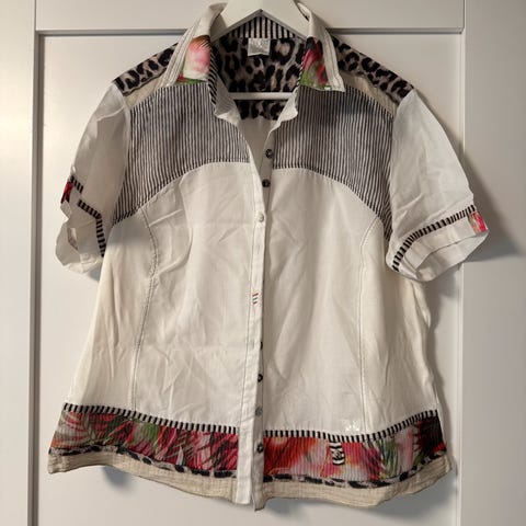 Nydelig hvit skjorte med kort arm. 100% bomull. Broderier i blått på bryst og langs ermer. Lukkes med knapper i hemper. Fra XLNt by KappAhl, tidligere kolleksjon, ikke lenger tilgjengelig i butikk eller på nett.