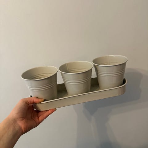 Pent brukt base for blomsterpotter til salgs. I plastikk men med "lærlook" med søm og tilhørende metallknapp (se bilder). Rustikk look.