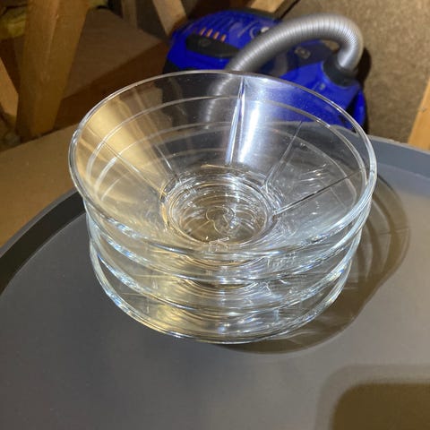 6 stk rødvinglass med dekor av sort spiral. H:23cm. Må hentes, sender ikke.