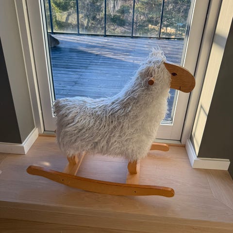 Gyngesau med hvit ull. Gyngesauen er dekket med ekte saueskinn. Ullen er tykk og myk. Rammen er laget av ubehandlet furu og dekket med saueskinn rundt kropp. Et morsomt alternativ til den klassiske gyngehesten. Trenger en runde med støvsuger. Hentes på Kolbotn.