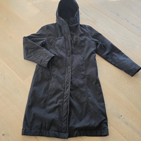 Kjempekul linkåpe eller lang jakke i fin høstfarge som har mange fine detaljer i en litt frynsete og avslappet stil. Bronsefargede knapper og applikasjoner.
