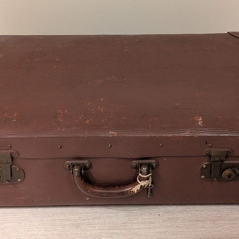 Koffert i stiv papp. Brun. Pent eksemplar. Fra ca. 1900. 34x58x19 cm.