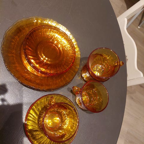 Selger 6 stk kopper til espresso eller kaffe. Er i presset glass med hanke i metall