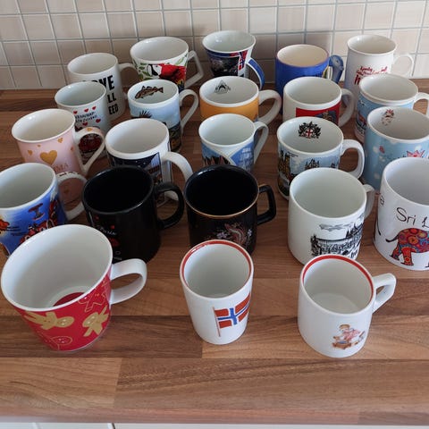 Kaffekrus i porselen med ulike sportsmotiver. Hver kopp har unike illustrasjoner som viser forskjellige idretter, og de er i standard størrelse for kaffekrus. Passer til bruk i hjem eller til for eksempel forsamlinghus/klubbhus