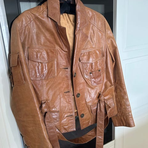 Jakke i flott lammeskinn med strikkehette/-krage. Kjøpt i Tyrkia. Størrelse M 38. Liten i str.