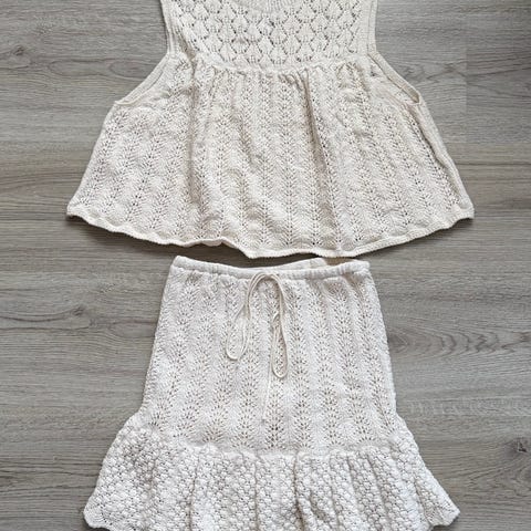 Hjemmestrikket skjørt i lengde 62 cm. Fargen er en elegant lys off hvite. Vesten henger løst uten lukking. Passer til en str. 38. Strikket i et mykt mohairgarn. One off the kind. Selges kr. 400 eller bud. Fix ferdig.