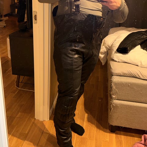 Halvarsson MC foret bukse i skinn, med seler, str. 40. Kjøpt på FINN, men ble for trang for meg. Er kanskje noe liten i str. Med beskyttelse på knærne.