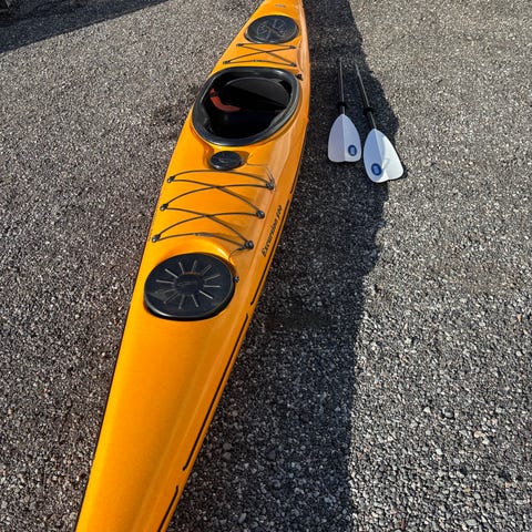 Fin glassfiber kajakk fra Ottersports. Meget stødig men samtidig rask. Kajakk er 60 cm bred og passer både til nybegynner og litt viderekommene. Denne er så stødig at den er trygg og fin i bølger. En fure under hele skroget og skikkelig ror bidrar til retnings stabilitet og gjør at den er lett å manøvrere. Sete og sparkebrett kan justeres etter størrelse på padleren slik at kajakken kan brukes av alle. Det følger med ryggstøtte som en kan velge å bruke eller ikke. Kajakk er i sterk orange farge som synes meget godt på sjøen. Kajakk er relativt solid uten å være alt for tung. Kajakk er i full lengde og har god bæreevne og passer også til litt tyngre personer. Kajakk er solid bygget og har en list av gummi rundt hele og også rundt cockpiten.