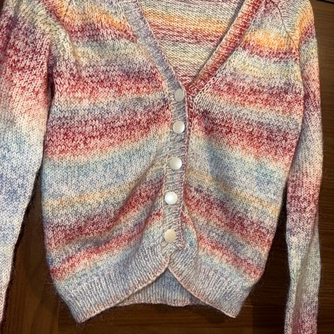 Cardigan fra Maison Scotch strikket i spraglete garn i beige, orange garn med gulltråder. Str. S