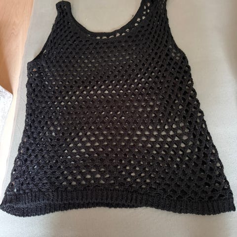 Egentlig heklet til meg selv, men den ble litt for stor enn det jeg prøvde på, så vil heller selge den. Jeg bruker vanligvis S/M i overdeler. Brystpartiet er heklet større, så de vil passe medium bryster vil jeg si, kanskje B-D cup (men varierer jo selvfølgelig så er vanskelig å si). Den er justerbar i ryggen, så vil passe de fleste. Skulderreimene har jeg sydd inn en stretchtråd så disse er stretchy og skal passe seg etter dine skuldre. Gjerne spør om du lurer på noe!