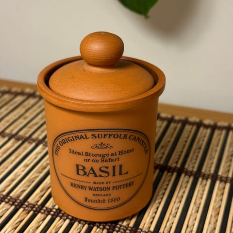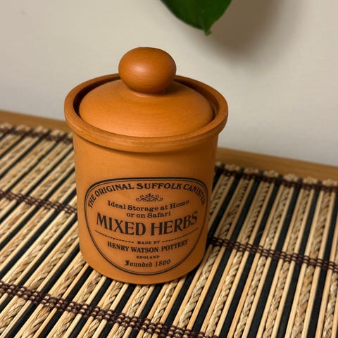 Søt liten sennepskrukke m/lokk. Terracotta og innvendig glassering.