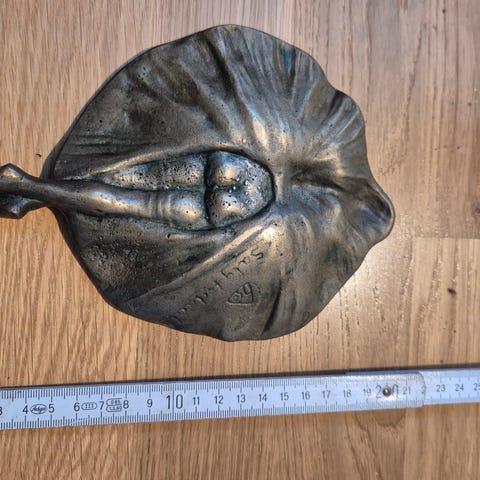 Porselens-askebeger med fugl, askebegeret er formet som blad. Ukjent produsent. Max mål; H:7,3cm. B:15cm. D:10cm. Må hentes, sender ikke.