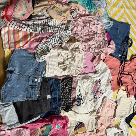 Pakke med jenteklær selges: 2 fine gensere, 1 varm og stilig kjole, 5 bukse og 2 stk.tights. Alt er fin brukt.