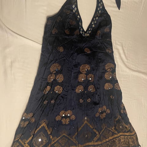 Blå kjole med glittertråder og heklet kant. 102 cm lang kan reguleres på skuldrene.