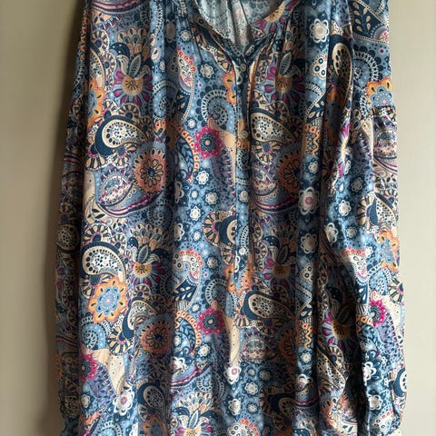 Tøff storskjorte i nydelig turkis med stjernepynt. 100% bomull. Onesize fra str. 36 til str. 42. Kan sende med Postnord til 69,-. Se også mine andre annonser ved å klikke på navnet mitt. Mye fint både gammelt og nytt til bra priser.